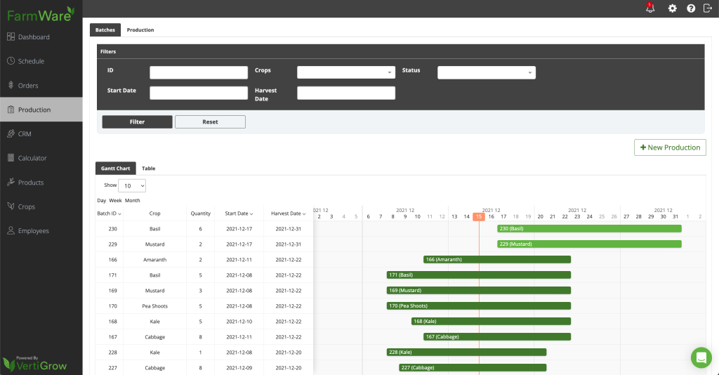1. The Gantt Chart view shows you for batches over time, along with batch ID, crop, number of trays, and start and harvest dates