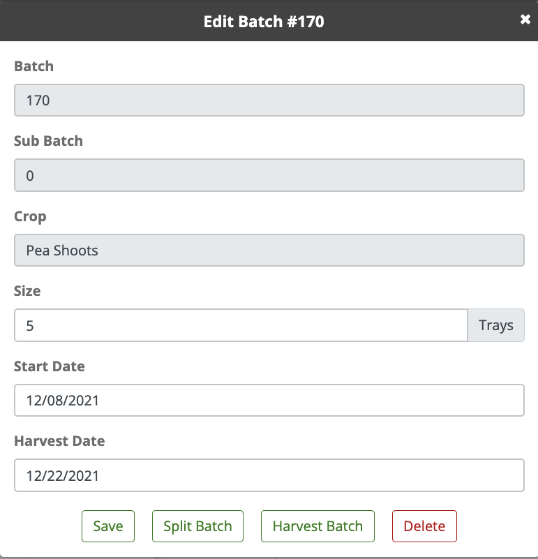You cannot change the batch IDs or the crop for traceability reasons, but you can change the number of trays and start/harvest date.